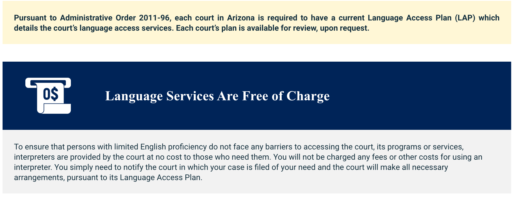 Arizona’s courts are required to provide a Language Access Plan to “ensure that persons with limited English proficiency do not face any barriers accessing the court,” according to the court’s website.