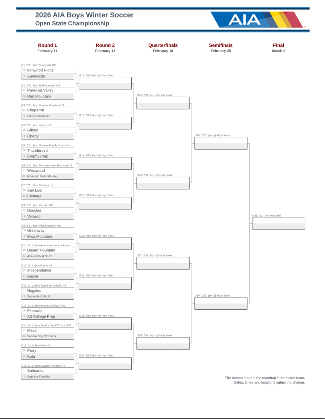 The 2026 AIA Boys Open State Soccer Championship bracket is out, with postseason play beginning Feb. 11 and the title match set for March 2 in Mesa.