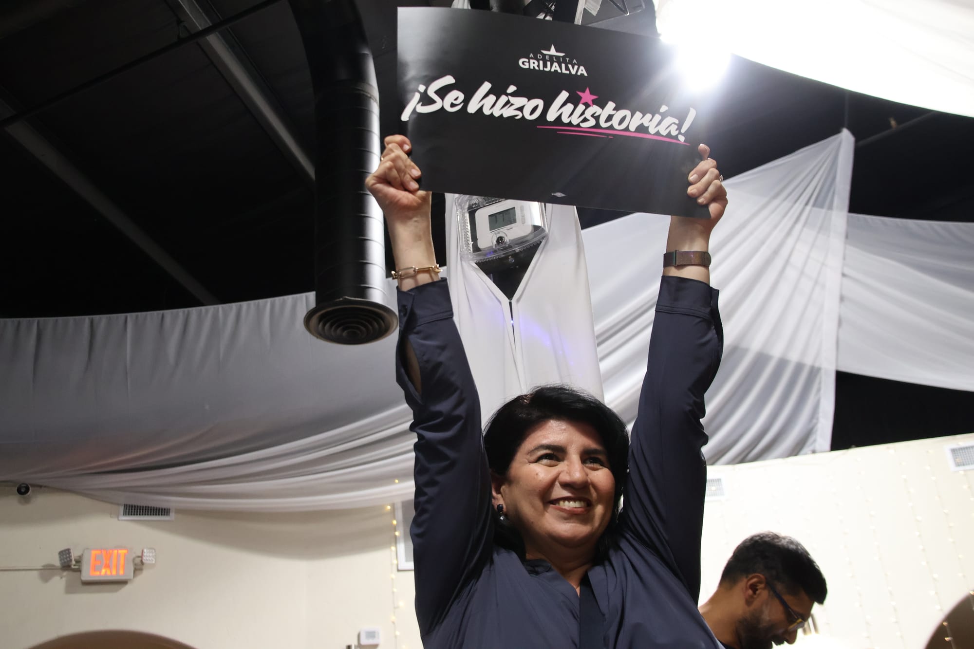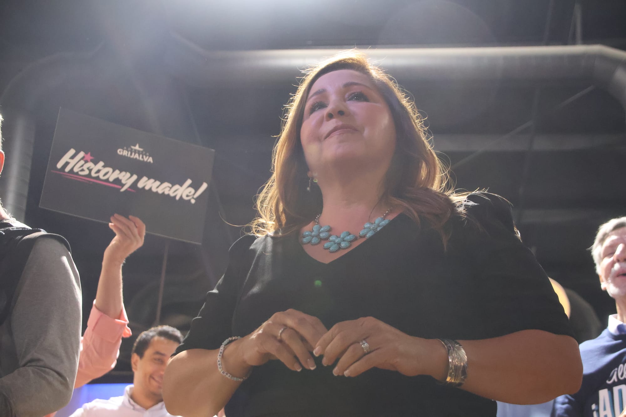 Shortly after 8 p.m., following an announcement that Grijalva had won, she made her way to the stage and greeted the crowd chanting, “Si se Puede.”