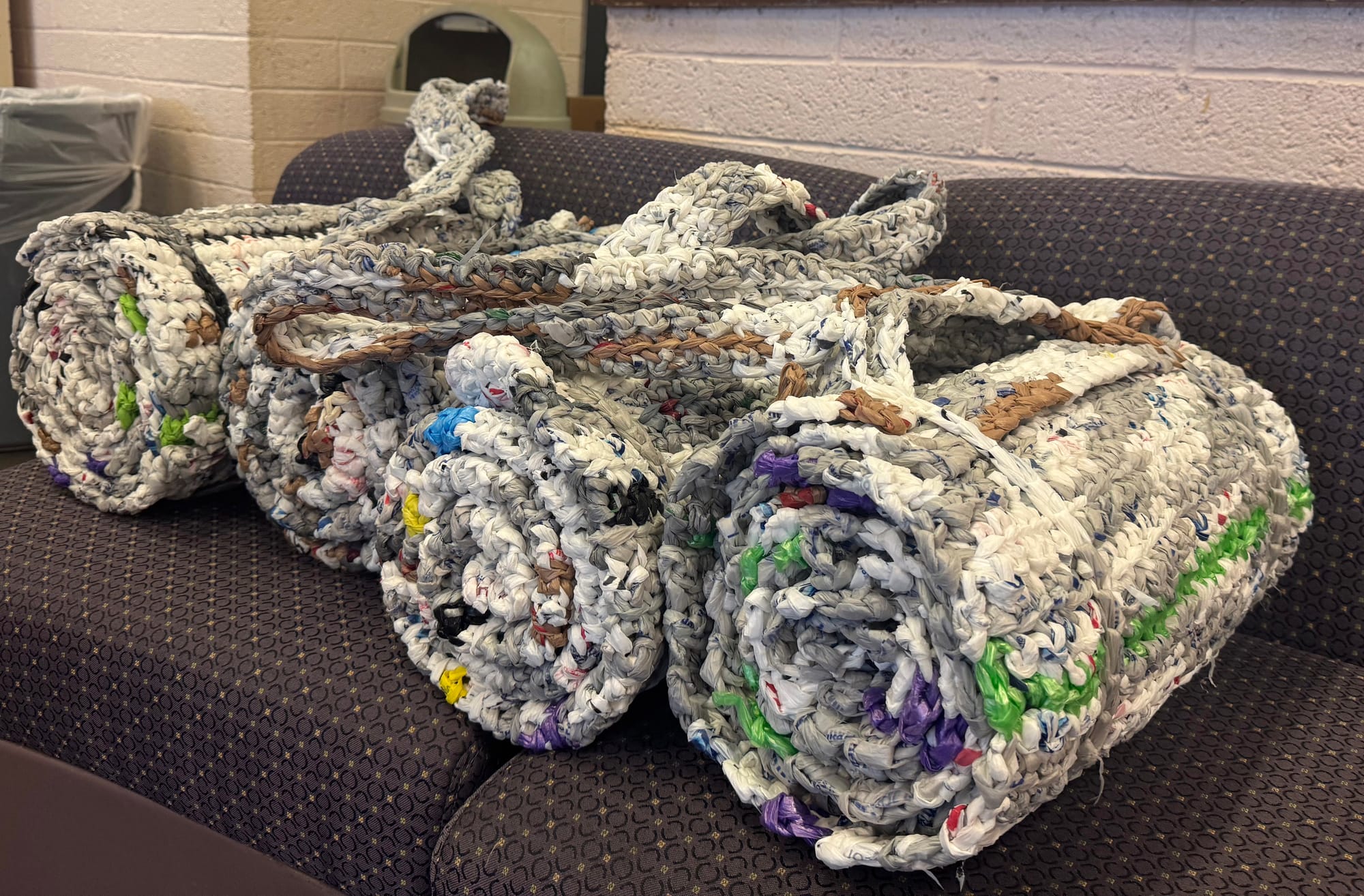 The project originated from group member Patricia Dotts’ trip to New York, where she watched people turning plastic bags into yarn — or plarn, as she called it. She decided she could do it too.