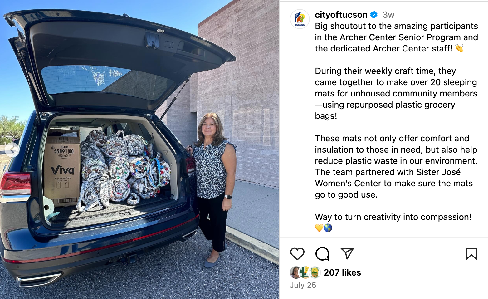 Retirees at the Fred Archer Center are transforming donated plastic bags into lightweight sleeping mats, which they deliver to Sister José Women’s Center to support women experiencing homelessness.