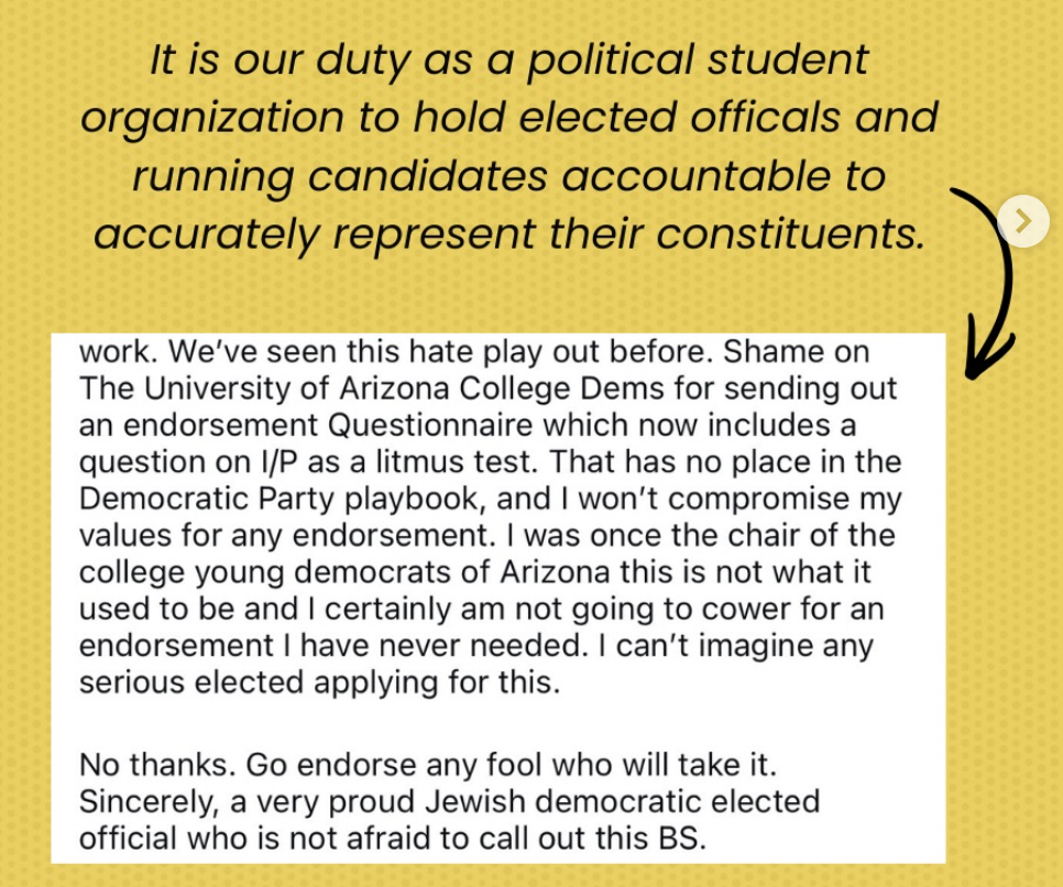 The University of Arizona College Democrats are facing threatening messages after state Rep. Alma Hernandez accused the student group of using Israel and Palestine as a political litmus test.