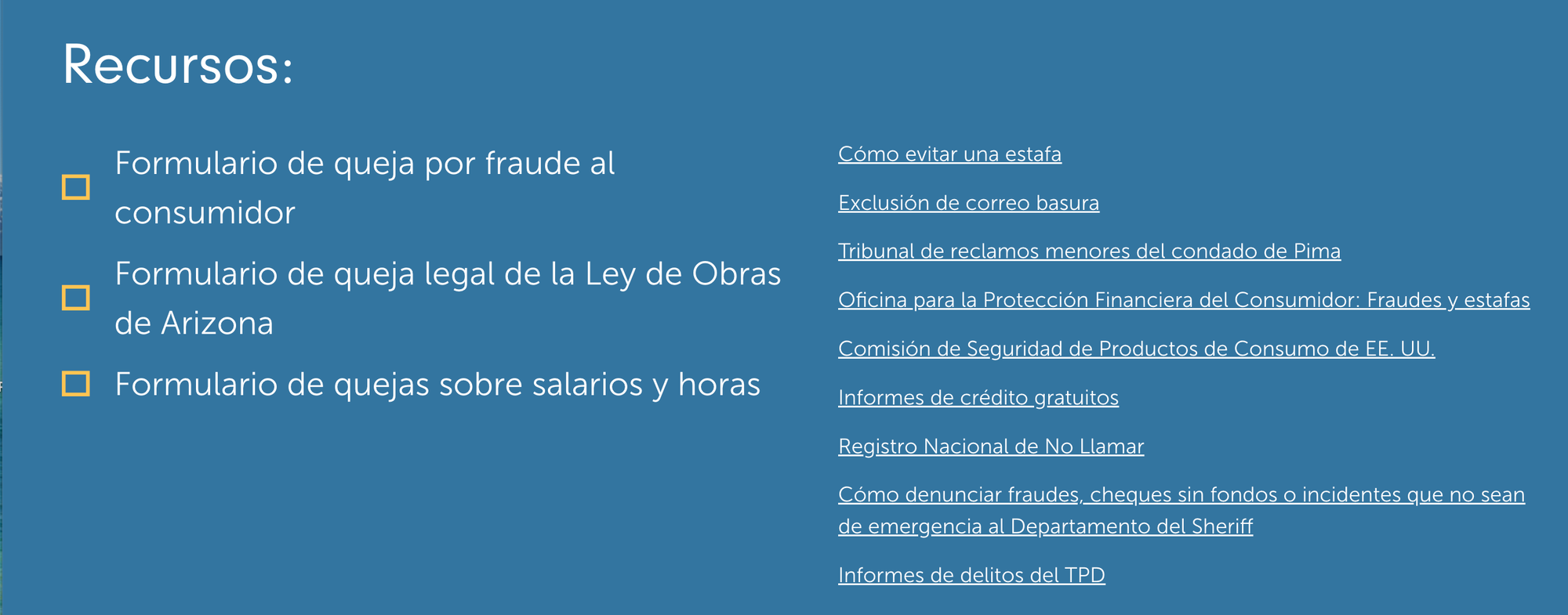Las estafas se pueden denunciar ante el Better Business Bureau y la Unidad de Fraude de la Fiscalía del Condado de Pima. Para quienes deseen informarse sobre las estafas y cómo evitar ser víctimas, el Departamento del Sheriff del Condado de Pima ofrece información y recursos en su sitio web y organiza conferencias a solicitud.
