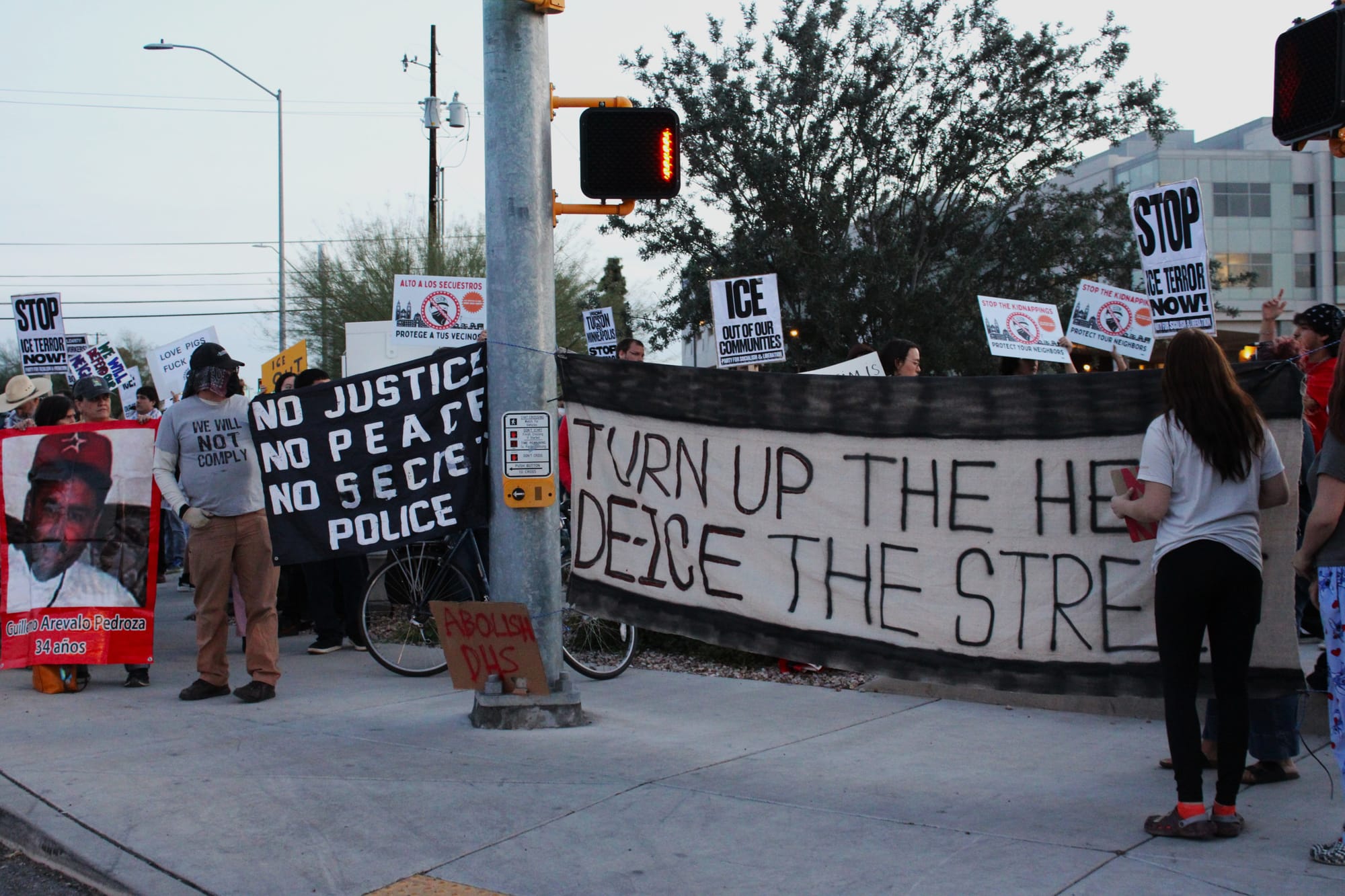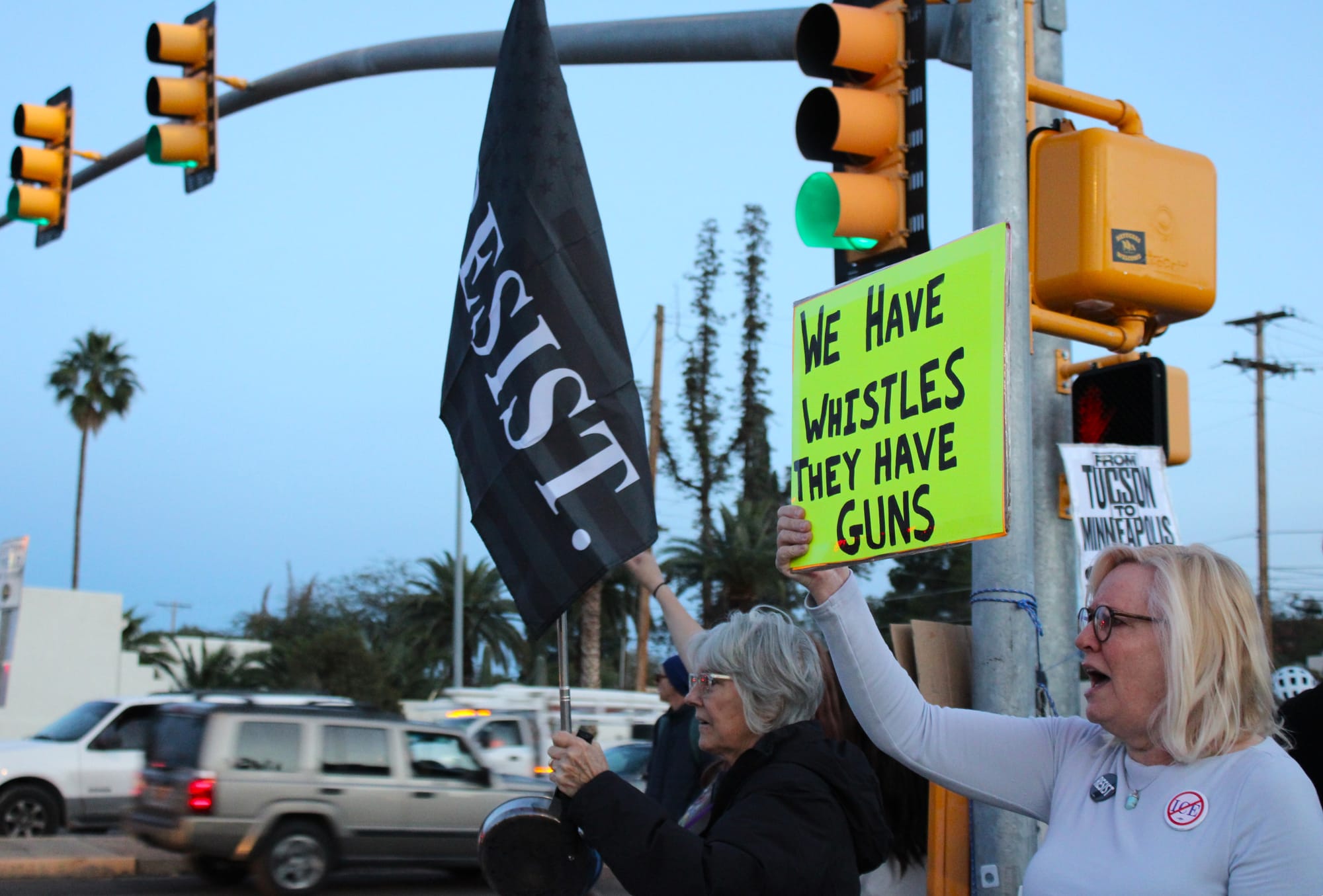 Dozens of Tucsonans gathered Tuesday evening outside the hospital, banging drums and holding signs with phrases such as “Turn up the heat; De-ICE the streets,” “Defend Democracy” and “We have whistles, they have guns.”