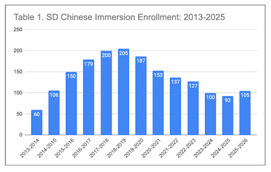 The Chinese immersion program was originally designed to host 300 students with 12 full-time employees. It currently operates with 105 students and 3.5 full-time employees, a 30-to-1 student-to-teacher ratio.