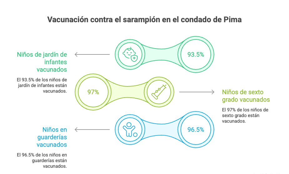 En el condado de Pima, el departamento de salud informa que el 93.5% de los niños de jardín de infantes, el 97% de los niños de sexto grado y el 96,5% de los que asisten a guarderías están vacunados contra el sarampión.