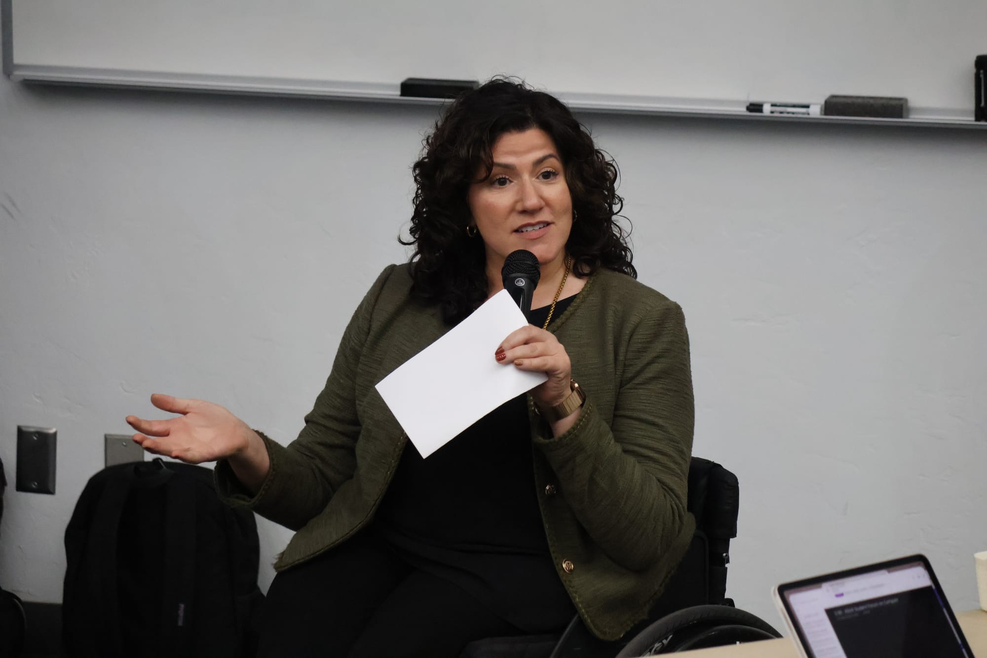 Después de la protesta, los estudiantes ingresaron a un aula para la sesión de escucha. La vicepresidenta de Asuntos Estudiantiles, Amanda Kraus, explicó que el objetivo del evento era recopilar las preguntas e inquietudes de los estudiantes y transmitirlas a los funcionarios de la UA.
