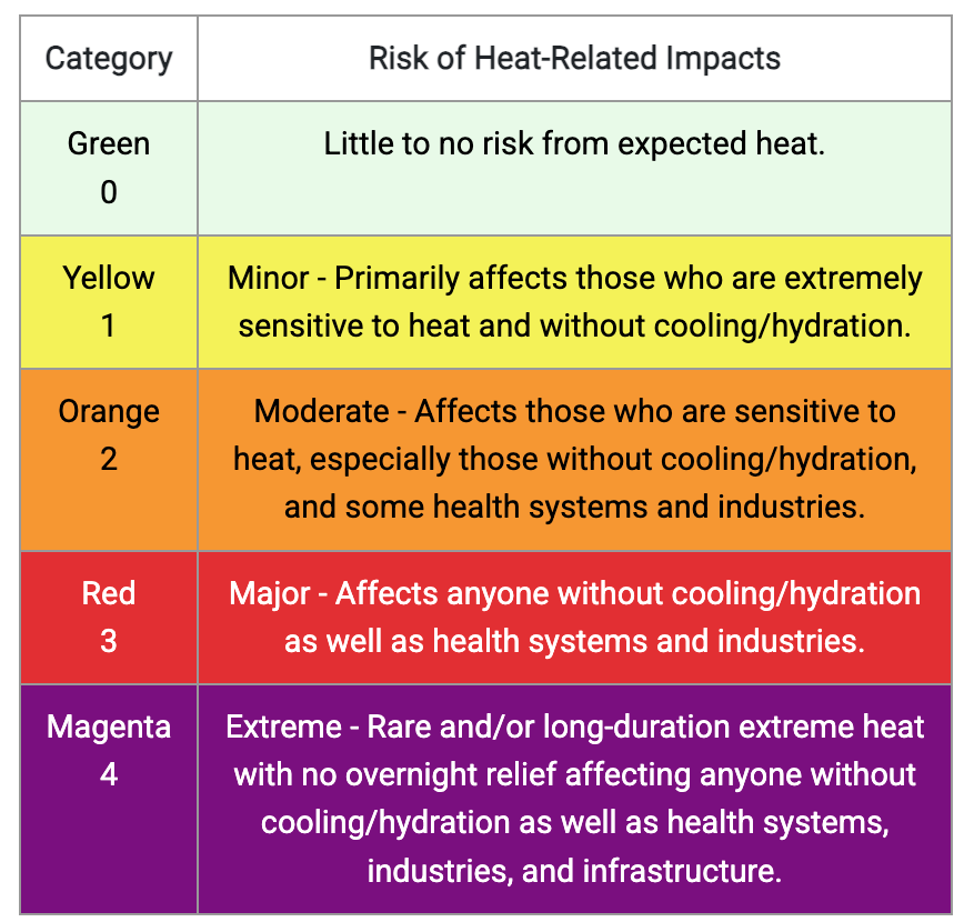 El Servicio Meteorológico Nacional utiliza una gráfica de índice de calor para medir y rastrear el calor extremo. Los niveles de temperatura se desglosan por color, desde bueno (verde) hasta peligro extremo (magenta). Este sistema de medición incluye datos que datan de 2005.