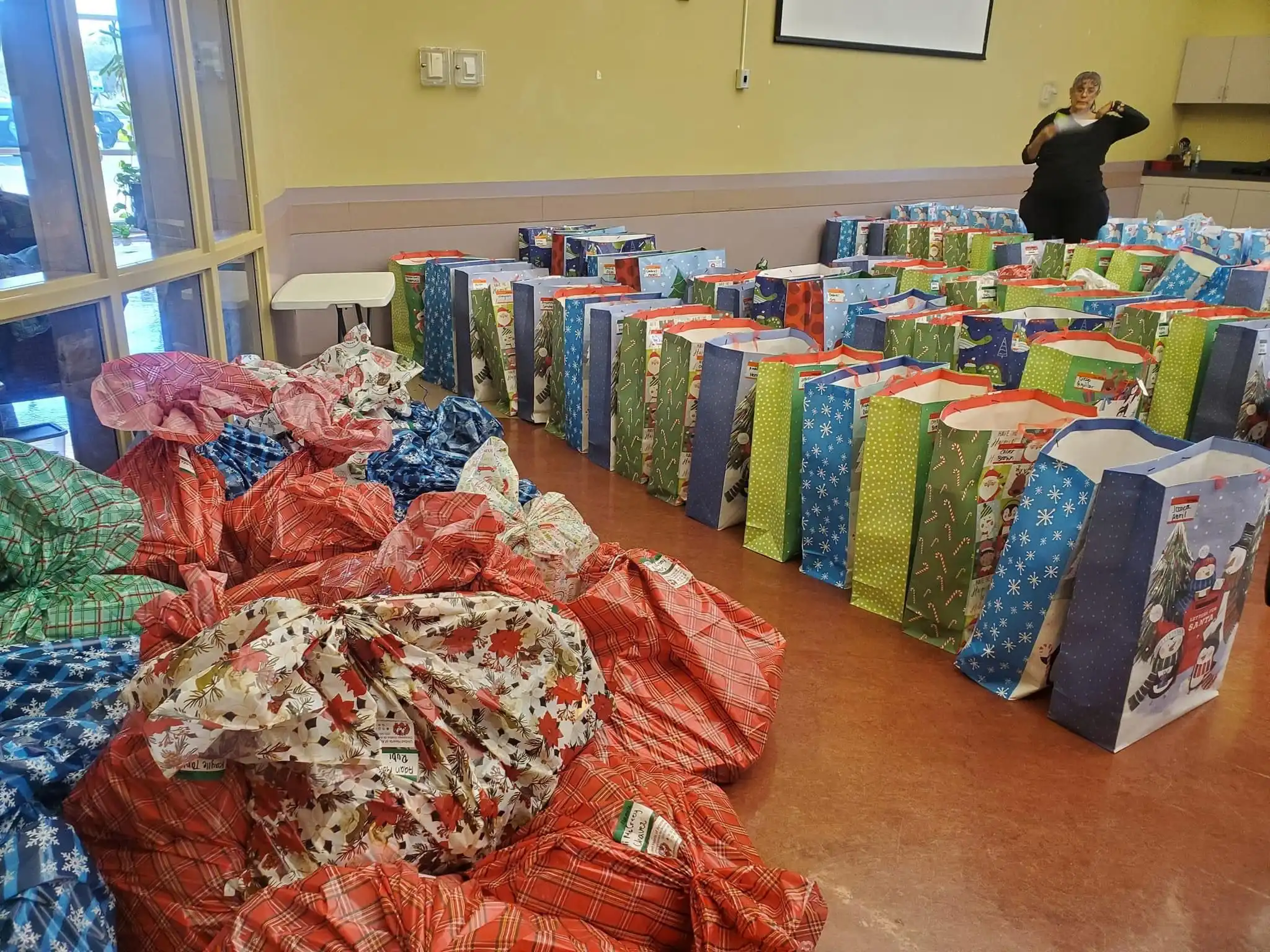 The Friday before the event, volunteers gather for a large packing day to assemble bags filled with clothing, toys, books, underwear and socks.