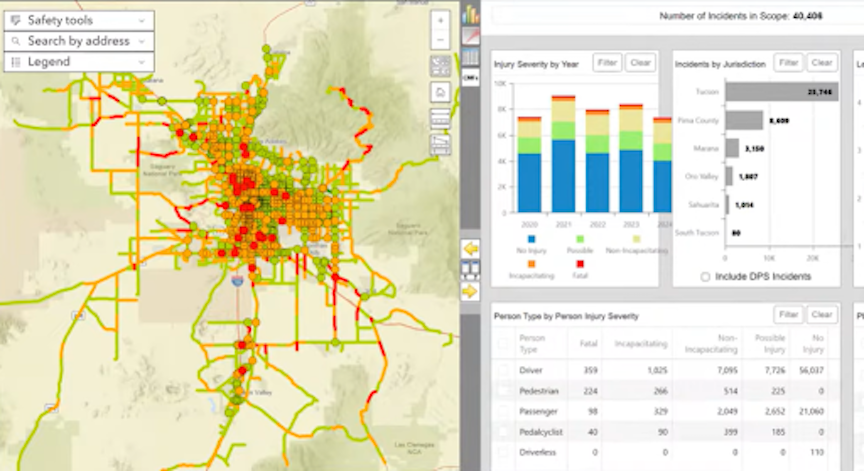 PÁG estableció el Explorador de Seguridad como un centro centralizado para datos regionales sobre accidentes y respuesta a emergencias, combinando registros del Departamento de Transporte de Arizona con iniciativas financiadas por Tucson y datos de teléfonos celulares de colaboración colectiva. La herramienta rastrea información detallada sobre accidentes, incluyendo el número y tipo de incidentes, la gravedad, la ubicación, la dirección de viaje, el tipo de vehículo y los datos del perfil de las personas involucradas.
