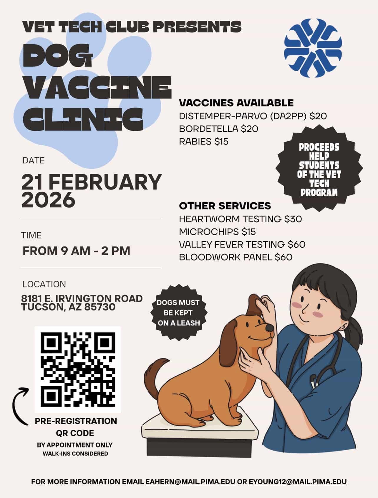 Pet owners looking for affordable vaccinations have a new option this weekend as Pima Community College’s Vet Tech Club hosts a low-cost dog vaccine clinic Feb. 21 at the East Campus.