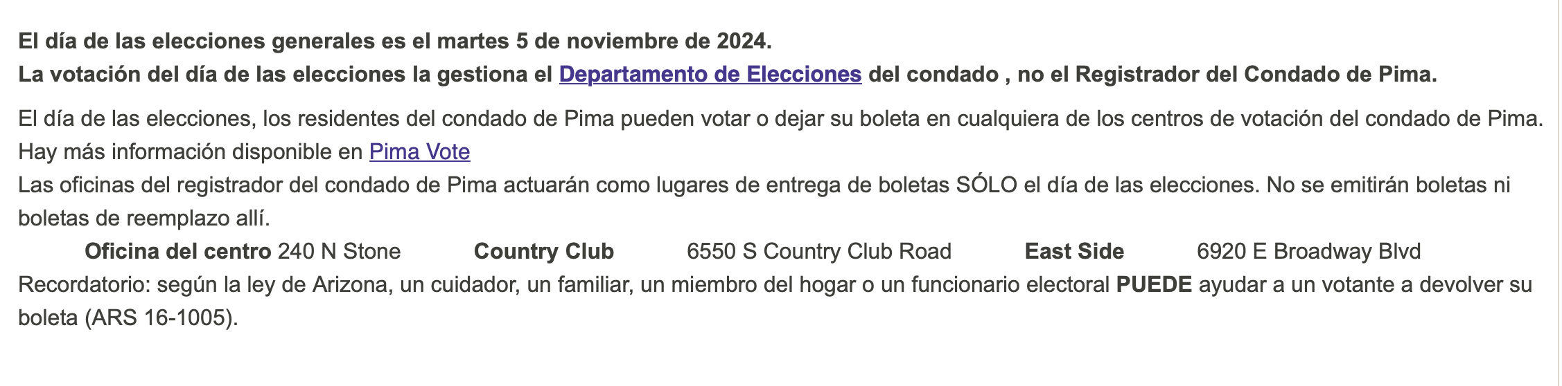 No solicites otra boleta ni intentes votar nuevamente. Es ilegal votar más de una vez en una elección. Puedes consultar tu estado aquí o llamando al 520-724-4330.