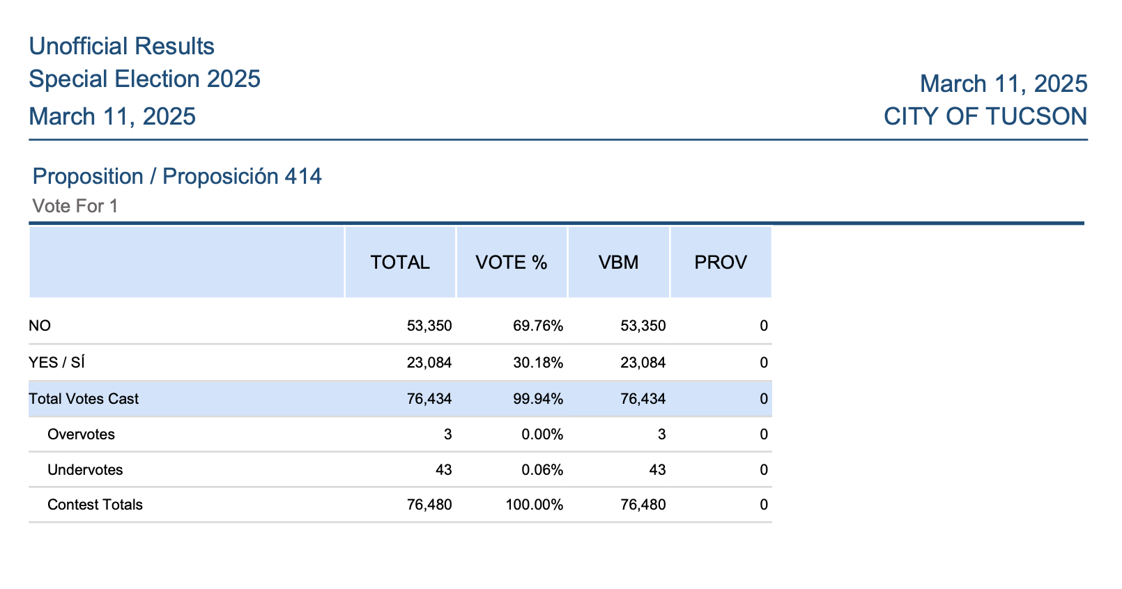 “While I am disappointed in the outcome of Proposition 414, I am grateful to the voters of Tucson and everyone who stood with us in this campaign,” Tucson Mayor Regina Romero wrote in a statement posted to her Instagram account Wednesday. “The challenges in front of us, in the face of hundreds of millions of dollars of reduced revenue from the state’s flat tax and uncertain federal funding combined with Trump’s chaotic economic policies, are a real concern for Tucson families.”