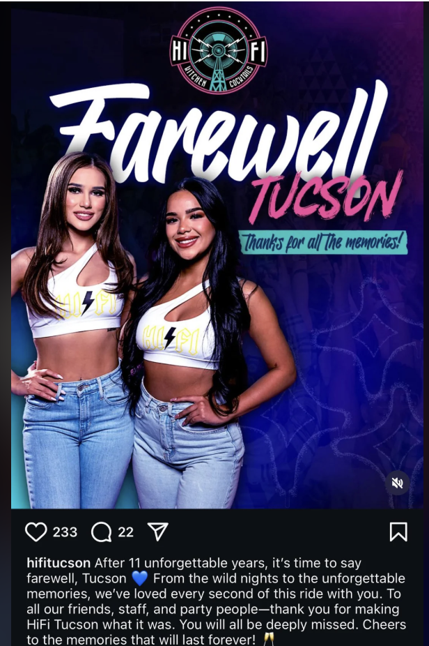 HiFi occupied a 6,000-square-foot indoor space with a 3,000-square-foot patio and developed a reputation for frequent disturbances downtown, leading Tucson police in 2020 to arrest three employees and a patron on charges related to narcotics sales and overserving alcohol.