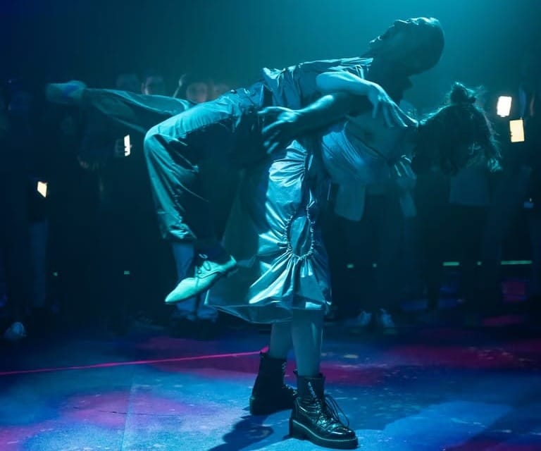 The protagonist and her father reunite on stage in a tense, physical exchange — he reaches for her, she slips away — before phones flash the message,"Resist the pressure."