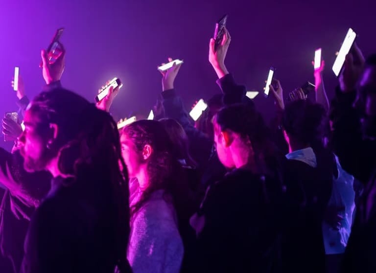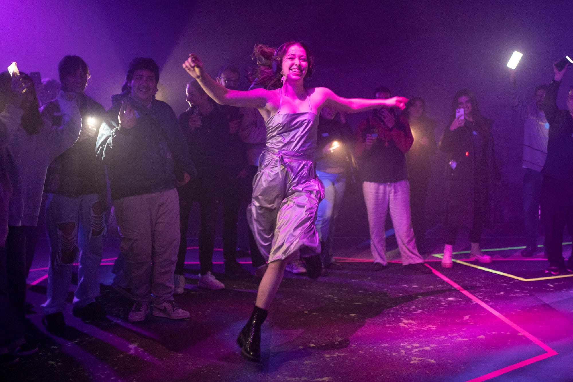 As the performance begins, phones flash with lightning before prompting audience members to answer a series of questions about themselves.