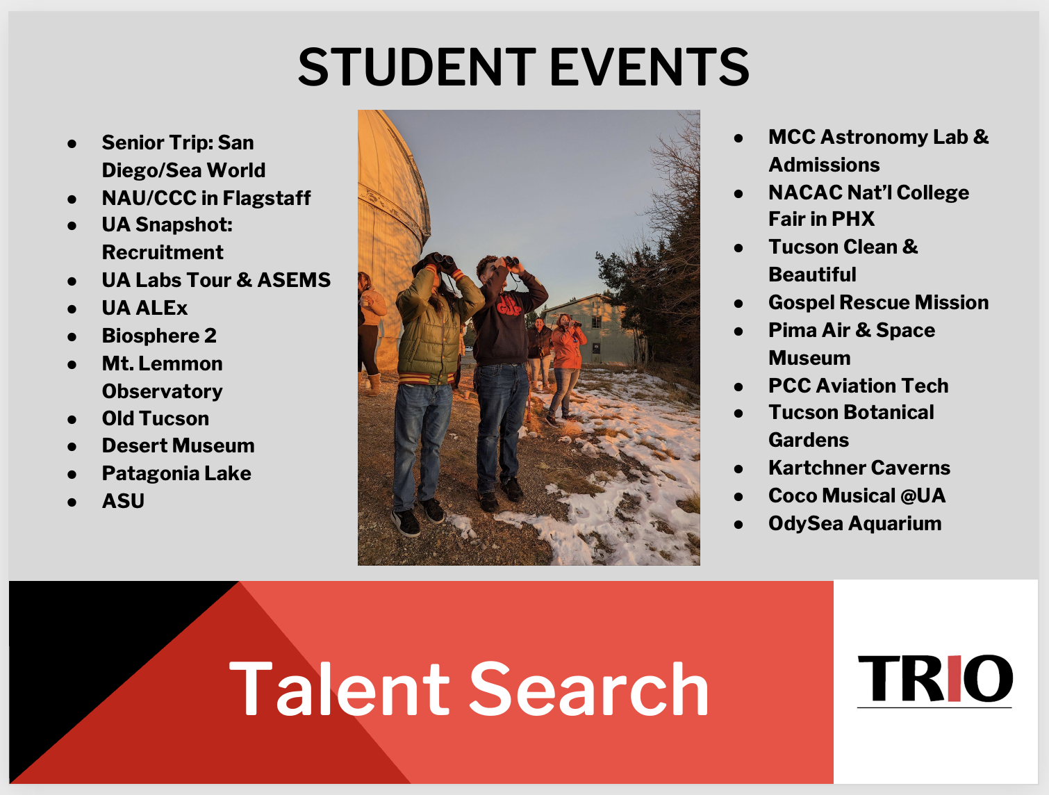 It also includes career services, tutoring, workshops, field trips and additional support. During their senior year, participants travel to San Diego to visit SeaWorld, but also get the opportunity to visit places like Patagonia Lake, the Pima Air and Space Museum, the Maricopa Community College Astronomy Lab, Biosphere 2, Arizona State University and more.