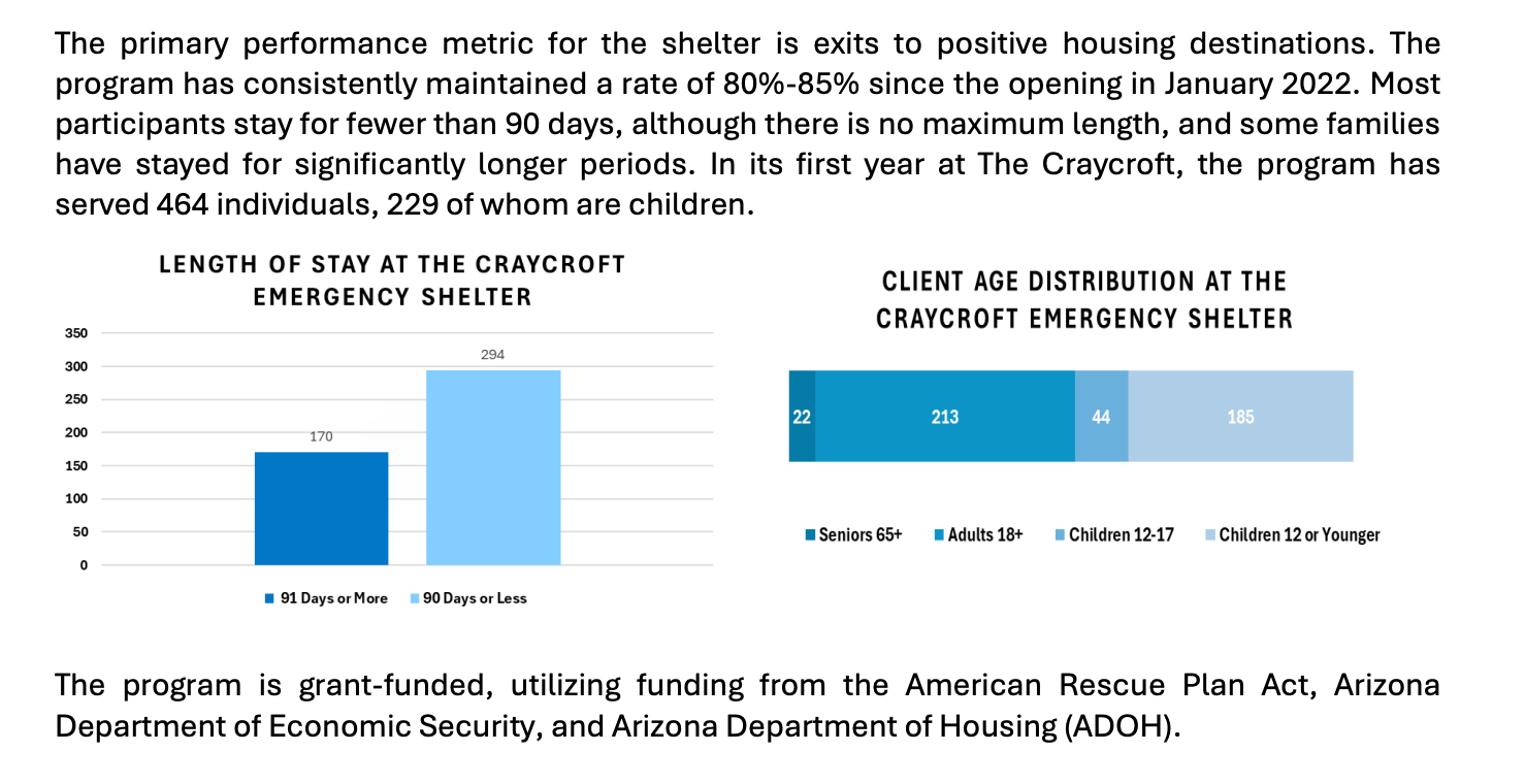 El Craycroft Shelter, anteriormente The Knights Inn, sirve como un componente clave del programa y ofrece 67 habitaciones para familias e individuos necesitados. El refugio está diseñado para ofrecer alojamiento temporal con servicios en el lugar para ayudar a los residentes en la transición a una vivienda estable.