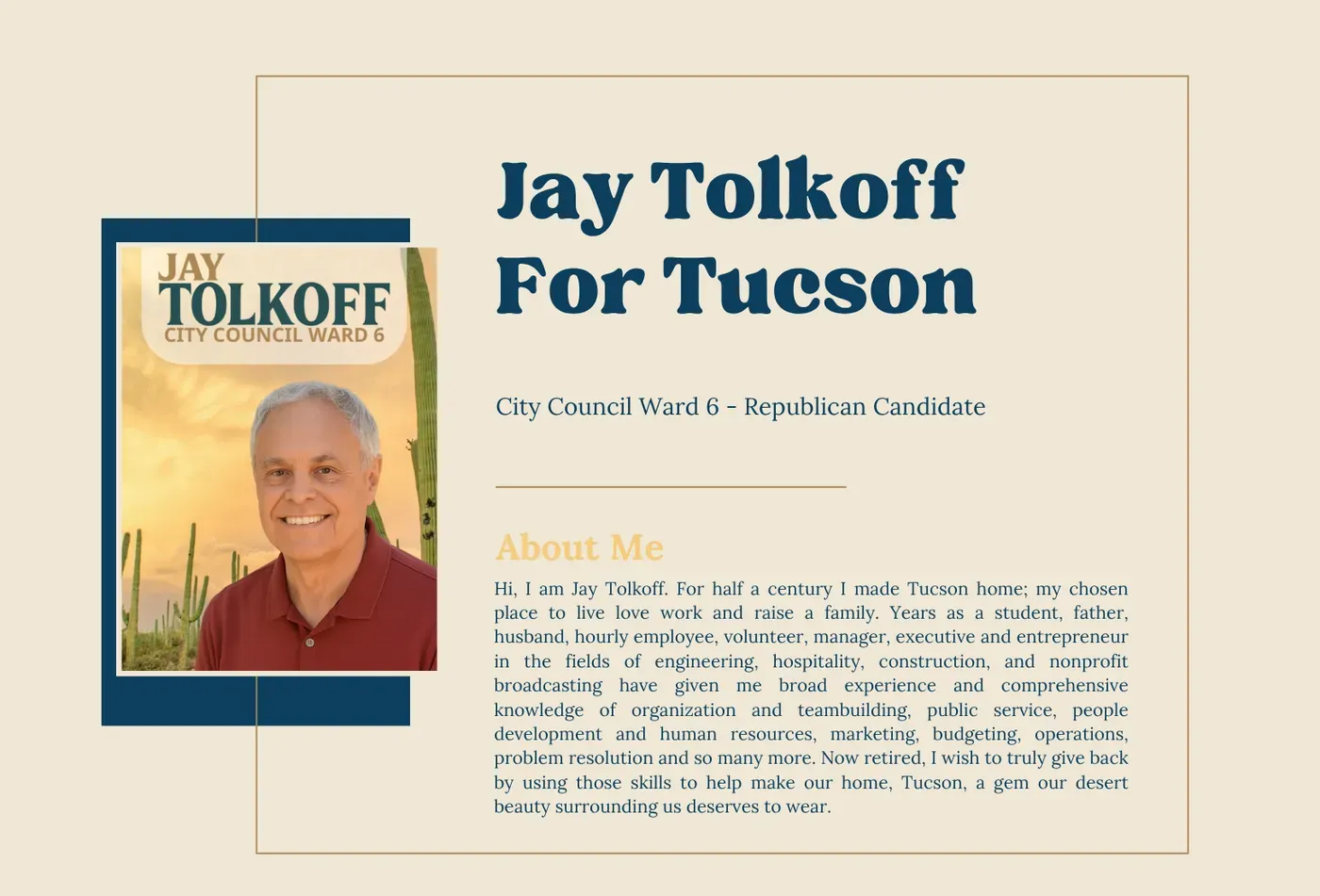 Jay Tolkoff is running for Tucson’s Ward 6 City Council seat, promising to address homelessness, public safety, and city budgeting with a focus on accountability and root causes.