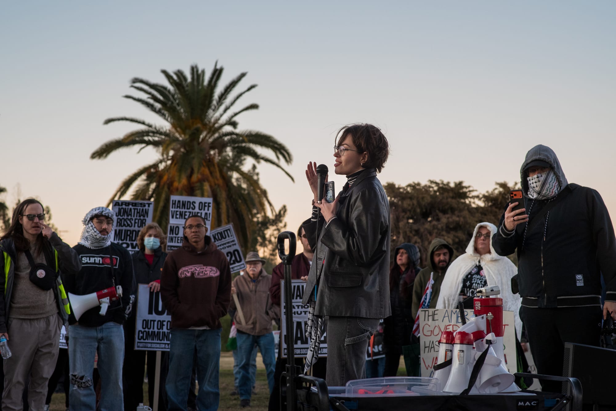 The event opened with speakers condemning U.S. interest in Venezuelan oil and warning about the impact of Immigration and Customs Enforcement on local communities.