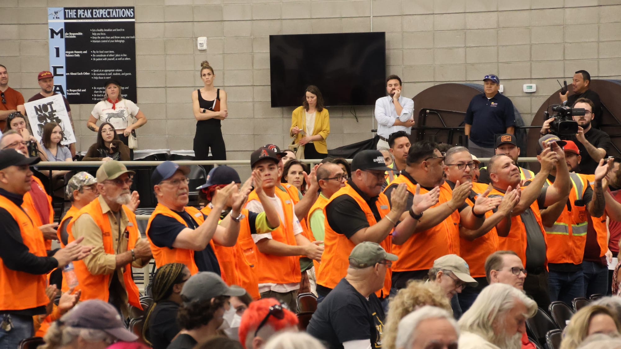 Members of several labor unions attended the meeting, wearing orange safety vests to show their support for Project Blue.