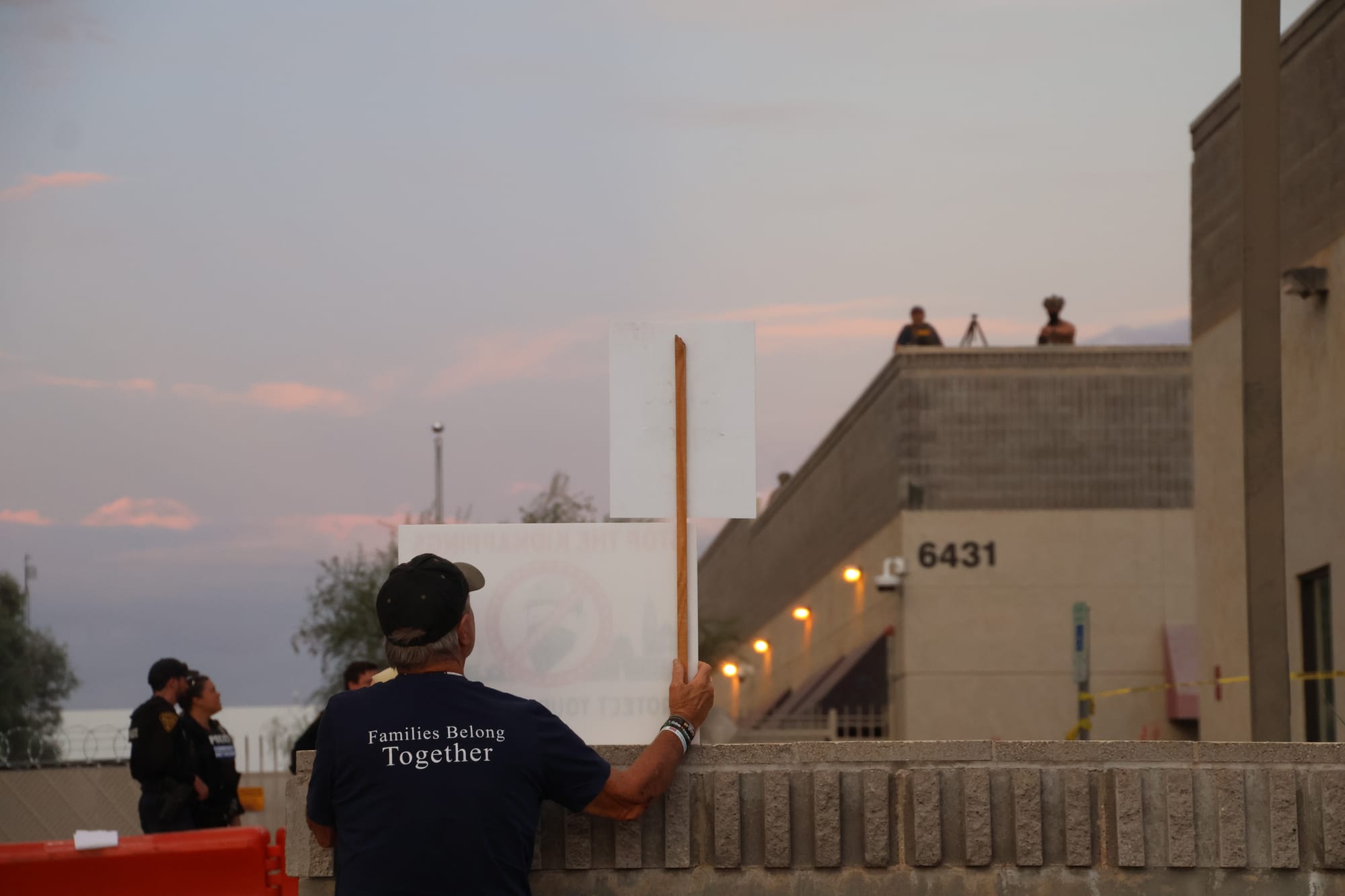 Before the event’s start, Tucson police barricaded and taped off the Airport Business Plaza, where the Immigration and Customs Enforcement Field Office is located. More than a dozen officers were present, along with two Sun Tran buses, and armed police officers stationed on the roof of the plaza.