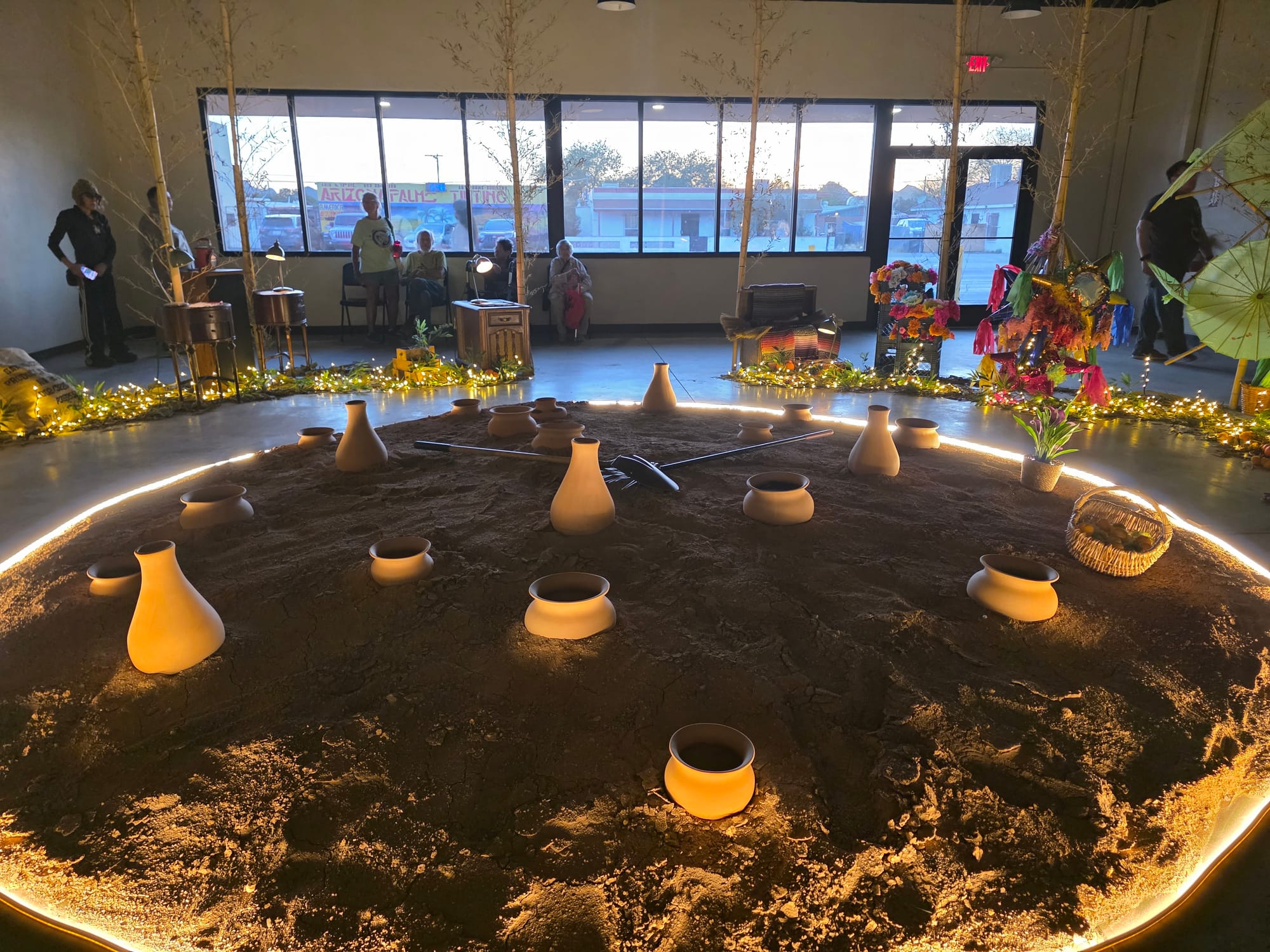 In the larger building, guests walked counterclockwise through an installation anchored by two circles. The outer circle served as an altar to the past, while the inner circle — clay pots in sand with tools at the center — pointed toward the future.
