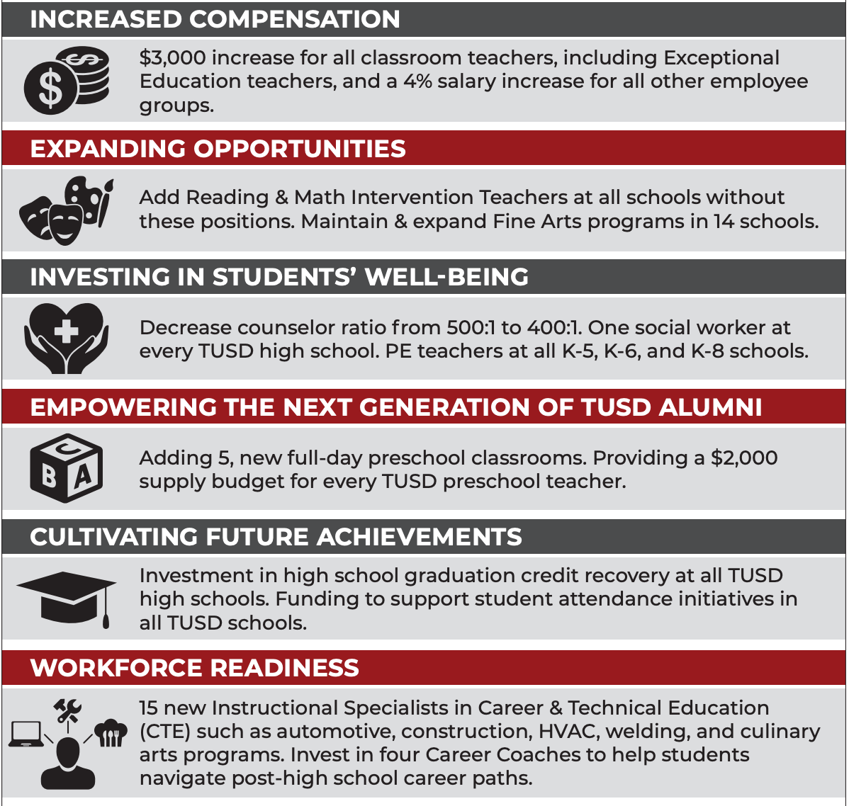 - Five additional full-day preschool classrooms and $2,000 in annual instructional supplies for all preschool classrooms
