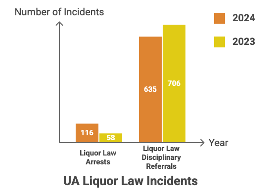 In 2024, the University of Arizona reported 116 liquor law arrests involving on- and off-campus incidents, up from 58 the year before, according to the annual security and fire safety report.
