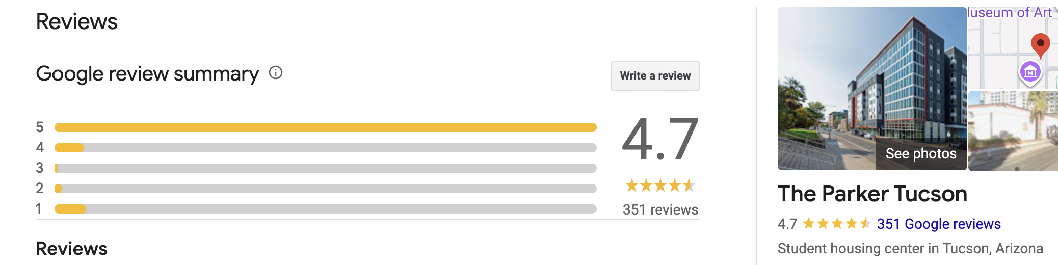 The Parker has a 2.8-star rating on Yelp, with many of the reviews mentioning deceptive business practices and issues with management. On Google, it has a rating of 4.7 stars, though many of the negative reviews mention similar issues.